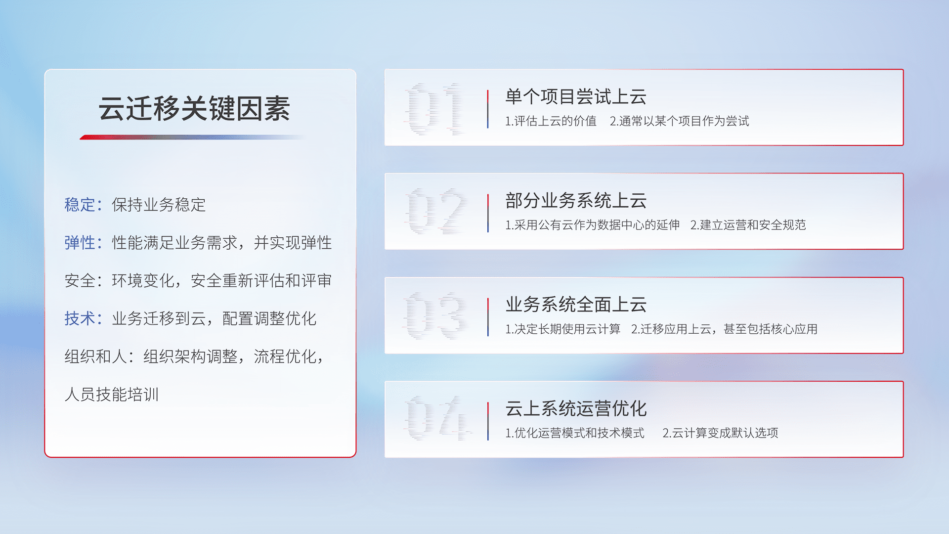 结合实际业务,,,,从规划设计、、、、云平台选型、、、云原生改造、、数据迁移、、、、集成交付,,迁移全过程为客户识别最佳上云路径,,,,做好风险识别管理,,,设计网络架构、、、、身份权限、、安全审计合规、、、、操作审计、、、、日志审计、、、监控告警策略、、、多站点容灾设计等,,对云上基础设施进行整体规划,,,,提升IT治理水平,,以满足弹性、、、高可用、、、高性能的需求。。。