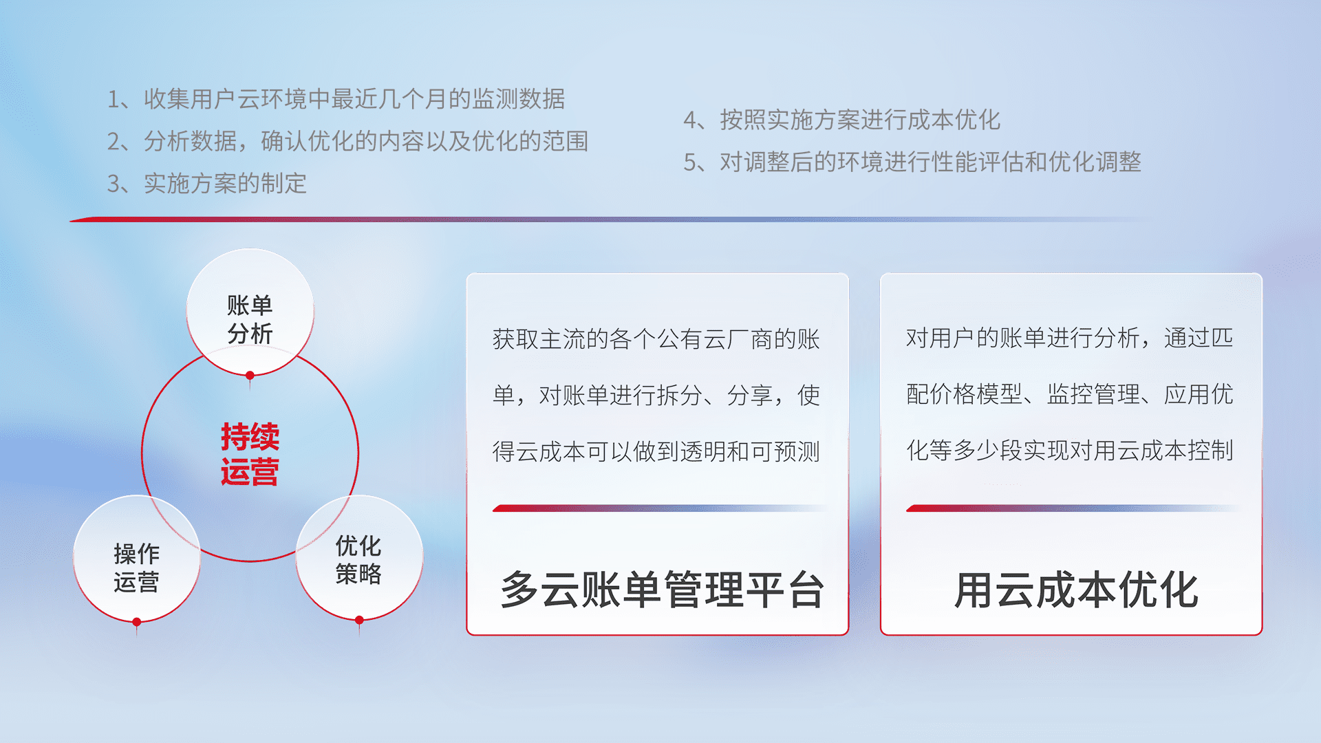 通过多云纳管,,,以统一的资源数据模型把客户的云资源进行抽象和封装,,进而实现对多云资源的统一操作,,保障云资源管理的可靠性、、、稳定性与可用性。。量身定制化运维内容,,配置、、开发运维、、、补丁管理、、、备份、、、、监控、、认证和访问管理、、、审计和日常巡检等,,,,保障在用云过程中的可靠度,,,,稳定度以及高可用率。。。