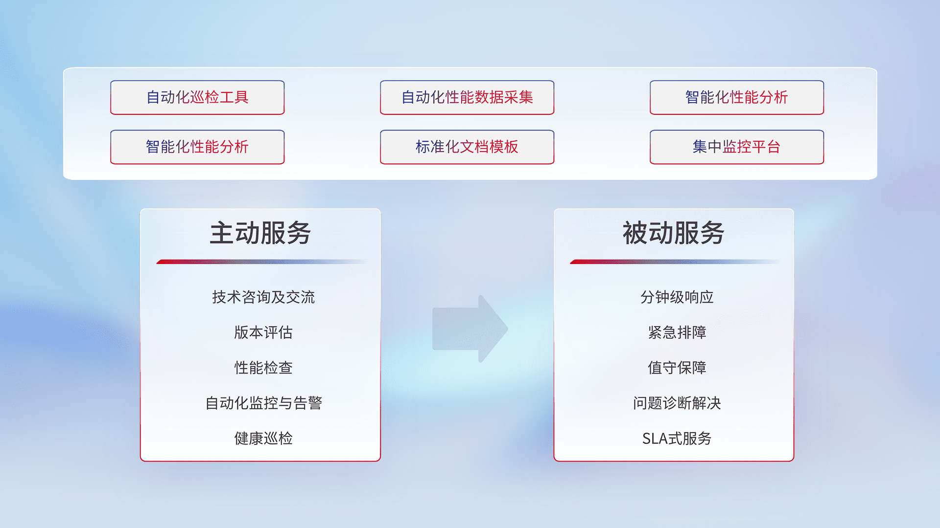 智能化工具和标准化文档,,,保障服务质量,,,提供主动服务(包含技术咨询、、版本评估、、性能检查、、自动化监控与告警、、、、健康巡检)和被动服务包含(分钟级响应、、、紧急排障、、、、值守保障、、、问题诊断解决、、SLA服务)。。。
